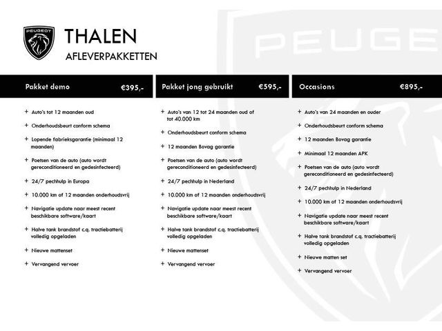 Welkom bij Autobedrijf Thalen Beilen B.V. Sinds 1968 zijn wij officieel Peugeot dealer in Beilen, ook zijn wij al vele jaren BOVAG lid. Wij hebben altijd een ruim assortiment (jong) gebruikte auto's met een heldere historie. Wij proberen al onze auto's zo correct mogelijk te adverteren. Zet- en drukfouten zijn hierbij voorbehouden. Bij aankoop van een gebruikte auto kunt u bij ons kiezen voor een optioneel afleverpakket. De prijs van het afleverpakket is afhankelijk van de leeftijd en kilometerstand van de aangeboden auto. Al onze afleverpakketten bestaan minimaal uit; een onderhouds beurt volgens schema, 6 of 12 maanden (BOVAG) garantie, poetsen van de auto, 1 jaar pechhulp, bij Peugeot modellen jonger dan 6 jaar een navigatie update, halve tank brandstof c.q. geladen tractiebatterij en een nieuwe mattenset. Meer informatie over onze afleverpakketten kunt u vinden op onze website: www.autothalen.nl of via een van onze verkoopadviseurs op tel: 0593-582010. Naast verkoop is vanzelfsprekend inruil, financiering, private lease en financial lease mogelijk.